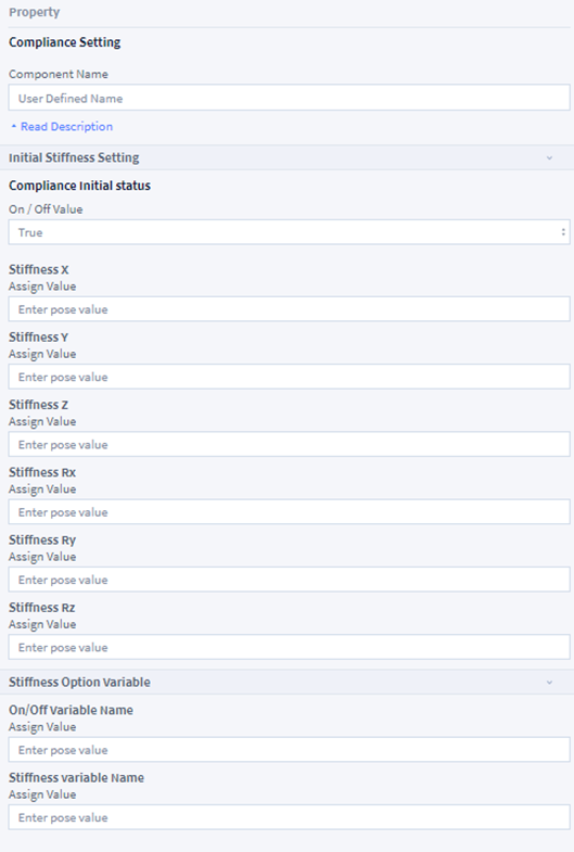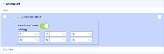 Compiance control(순응제어)을 설정하는 UI Component로 순응제어 모드로 전환 및 전환 시 stiffness를 설정할 수 있습니다.