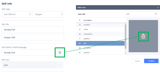 - 'Skill Icon'에서 '...' 버튼을 눌러서 Skill의 Icon을 설정하십시오. 두산로보틱스에서 미리 등록한 아이콘에 한해서 이미지 검색 및 등록이 가능합니다.