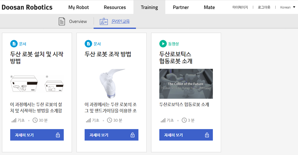 로봇을 조그 모드로 구동하거나 태스크를 생성하는 방법을 온라인 교육으로 제공하고 있습니다.