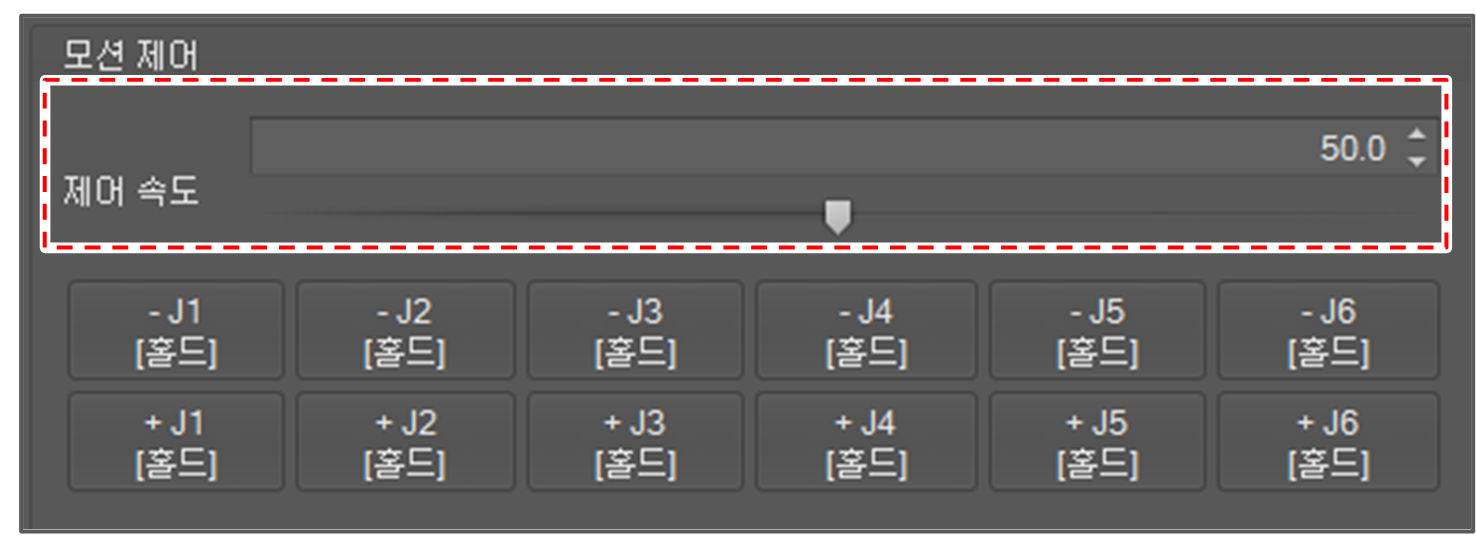 조그 속도는 퍼센트 단위로 설정됩니다. 100%의 조인트 각도 속도는 30 degree/second입니다. 속도를 설정하려면 스핀 버튼을 누르거나 슬라이드 바를 움직이십시오.