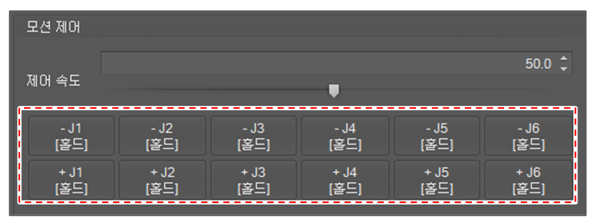 각 조인트 플러스(+) 나 마이너스(-) 버튼을 이용해 관절 각도를 조그 할 수 있습니다. 버튼을 놓으면 움직임은 멈춥니다.