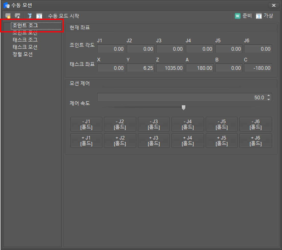 수동 모션 목록에서 조인트 조그를 선택하십시오. 현재 조인트 각도와 TCP 위치가 표시되며 100밀리세컨드 간격으로 업데이트됩니다.