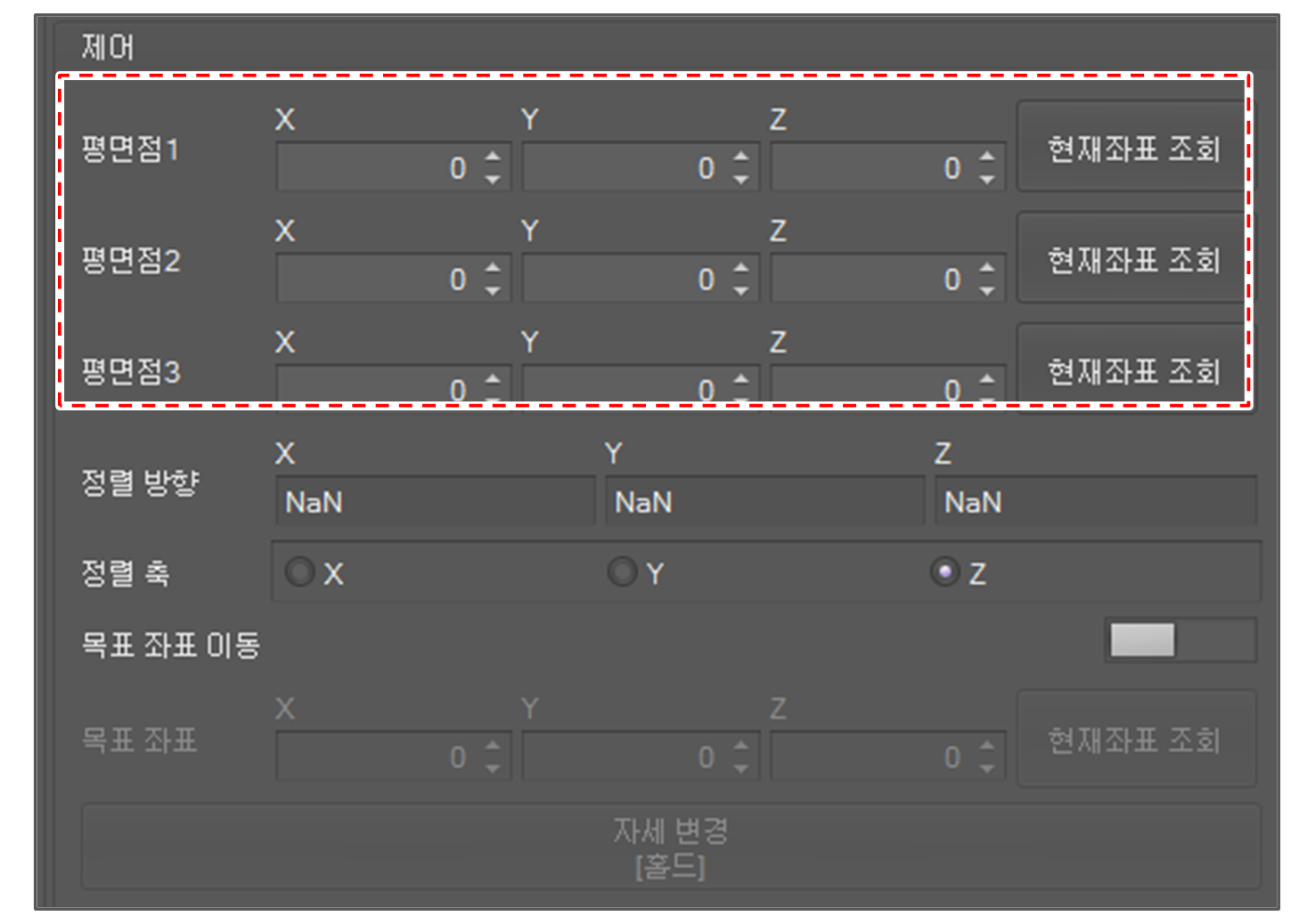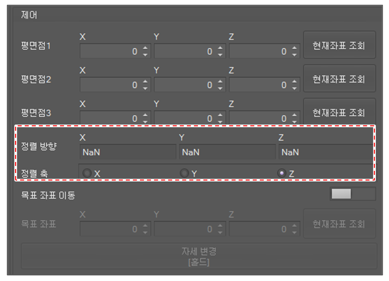 현재 포즈를 얻으려면 현재좌표 조회 버튼을 클릭하십시오.