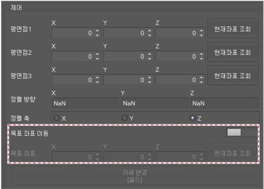 목표 좌표 이동 옵션 스위치가 꺼진 경우 로봇은 위치 이동 없이 툴의 방향을 바꿉니다.