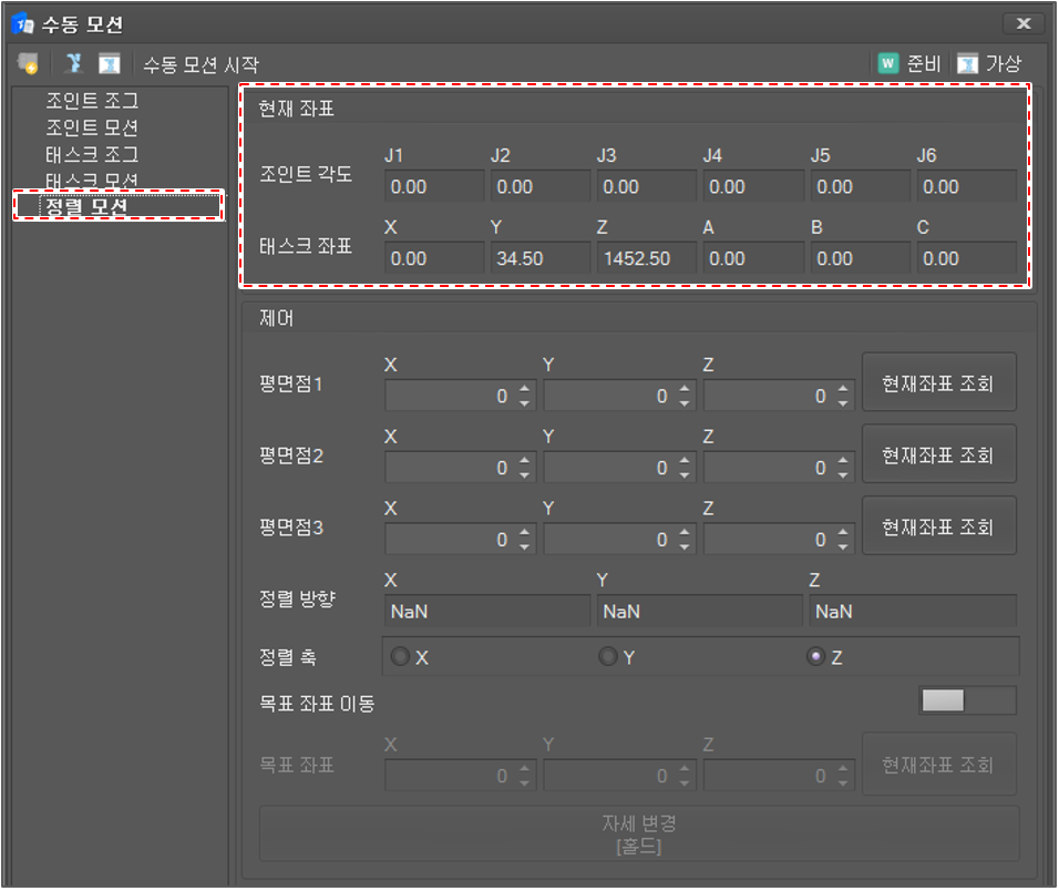 수동 모션 목록에서 정렬 모션을 선택하십시오. 현재 조인트 각도와 TCP 위치가 표시되며 100 밀리세컨드 간격으로 업데이트됩니다.
