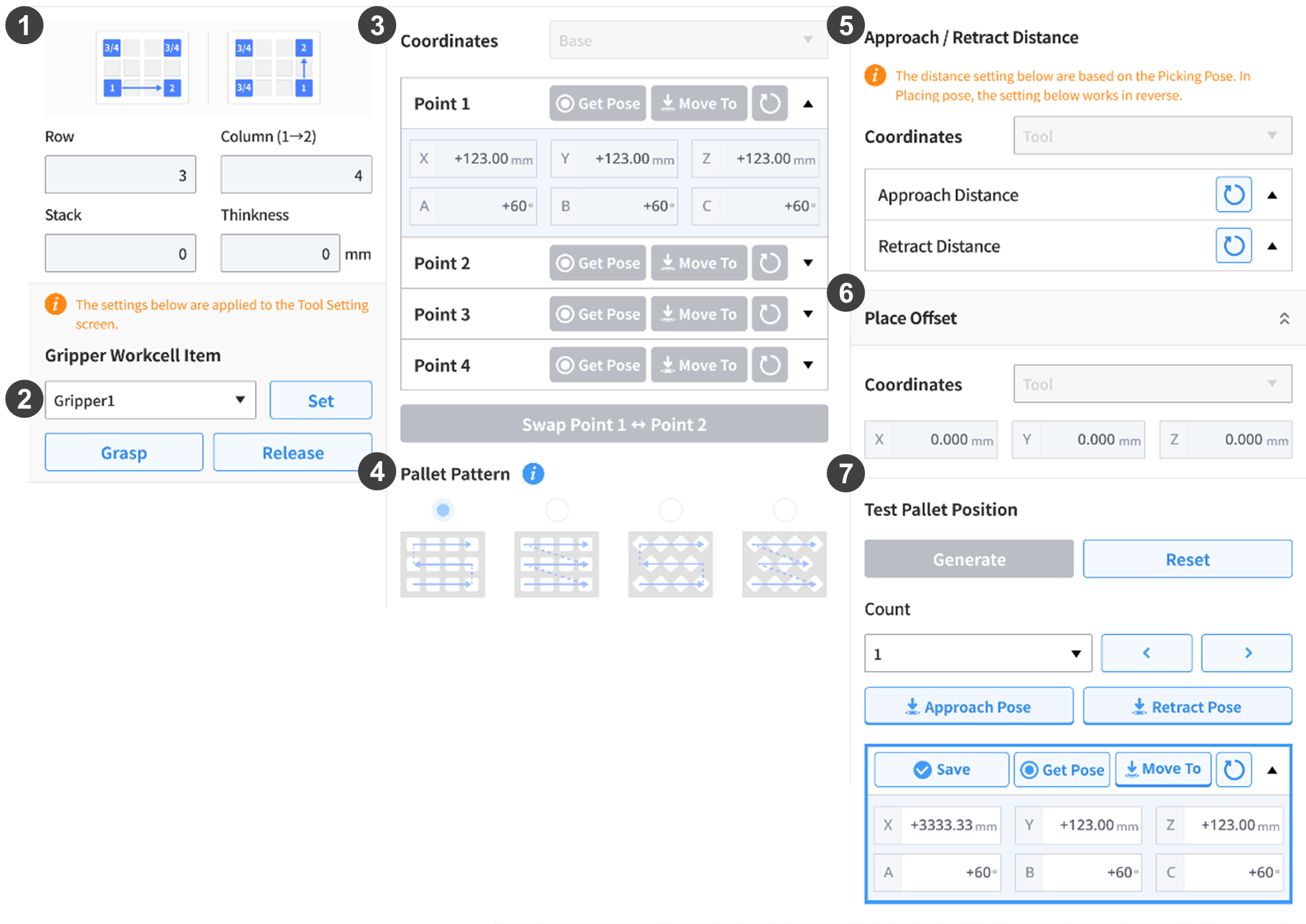 7 | 팔레트 포인트 테스트 | 생성된 팔레트 포인트를 확인하기 위해 Generate를 활용할 수 있습니다 수정된 값을 되돌리기 위해서 Reset을 활용할 수 있습니다. Count를 입력/선택하던가 <, >화살표로 확인하고자 하는 포인트를 선택할 수 있습니다. 포인트의 순서는 선택된 pattern정보에 따라 생성됩니다 Approach Pose 버튼을 이용해 Approach Pose로 이동할 수 있습니다. Retract Pose 버튼을 이용해 Retract Pose로 이동할 수 있습니다. Move To 버튼을 이용해 계산된 팔레트 포인트로 이동할 수 있습니다. Get Pose 버튼을 이용해 현재 위치를 불러올 수 있습니다 Save 버튼을 이용해 Get Pose된 위치(Cockpit 포함) 또는 수기로 입력된 위치정보를 현재 Count에 저장할 수 있습니다 |