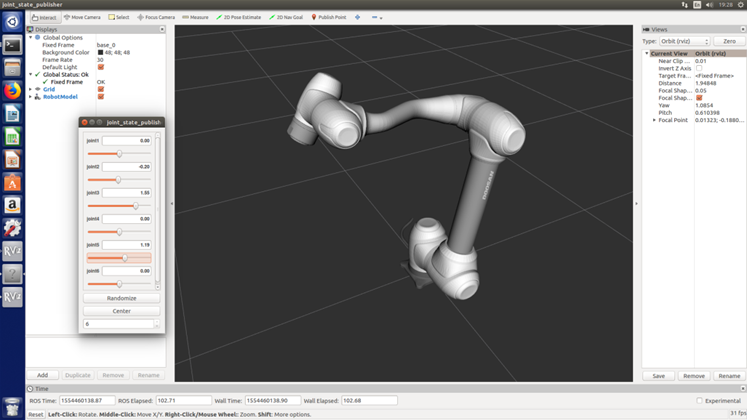하기 3.1 그림과 같이 Rviz 상에 로봇과 Joint_state_publisher 가 로딩 됨. Joint_state_publisher 를 통하여 로봇을 구동 시킴.