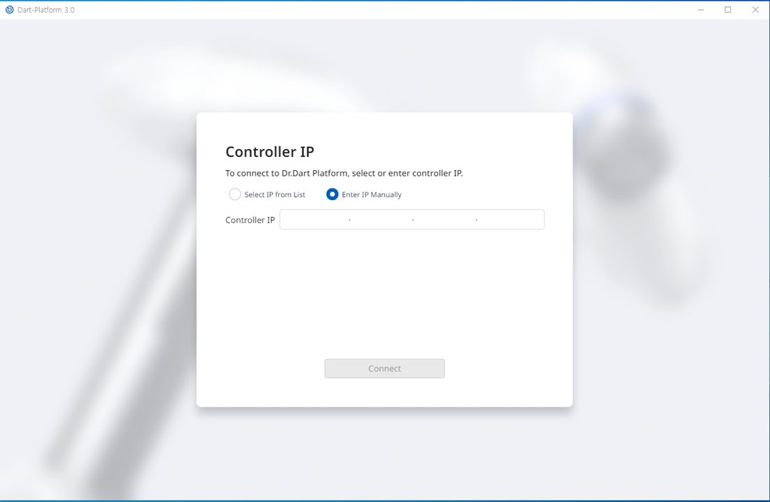 Laptop을 컨트롤러의 LAN포트에 연결 후 DART Platform을 실행하면, 연결을 위한 컨트롤러 IP주소, 하위제어기의 버전 정보 및 로봇 시리얼 번호를 자동 검색하게 됩니다.