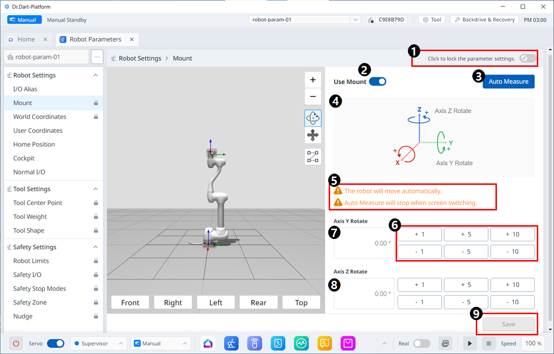 - 천장 또는 벽에 Robot을 고정 할 때, Y 축의 회전과 Z 축의 회전으로 Robot의 설치 각도를 설정할 수 있습니다.