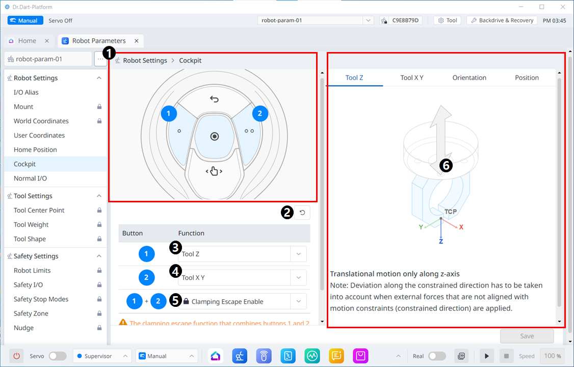 1번 버튼을 누른 상태에서는 자율이동(Freedrive) 모드가 되어 로봇을 자유롭게 움직일 수 있습니다. 사용자가 가한 힘의 방향으로 로봇의 각 관절이 이동합니다. 버튼에서 손을 떼면 로봇을 수동으로 움직일 수가 없습니다.