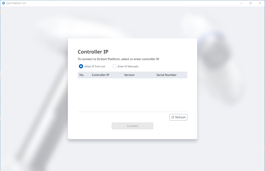 Laptop을 컨트롤러의 LAN포트에 연결 후 DART Platform을 실행하면, 연결을 위한 컨트롤러 IP주소, 하위제어기의 버전 정보 및 로봇 시리얼 번호를 자동 검색하게 됩니다.