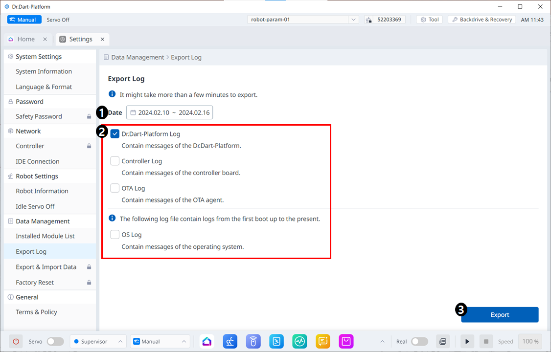이 메뉴에서는 Dr.Dart-Platform, Controller, OTA, OS 로그들을 내보낼 수 있습니다.