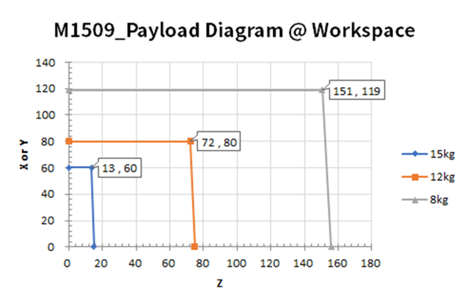 작업 영역 내에서 로봇의 최대 가반하중은 무게 중심 거리에 따라 달라집니다. 거리별 가반 하중은 다음과 같습니다.