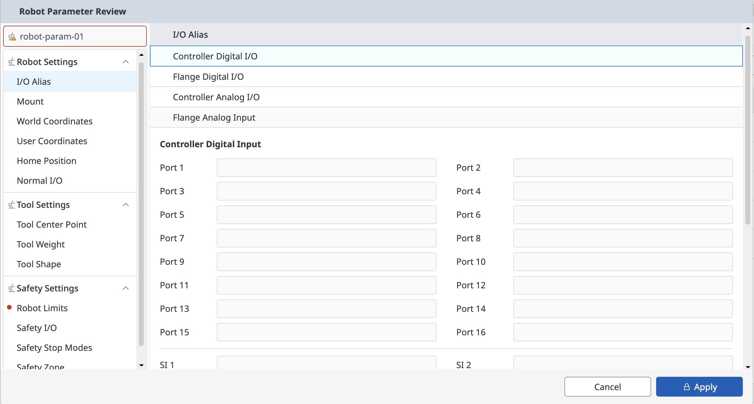 Robot Parameter 모듈 상에서 로봇 데이터 설정 값이 변경 된 경우 Safety Setting Review 팝업을 통해 바뀐 설정 값들을 저장할 수 있습니다.