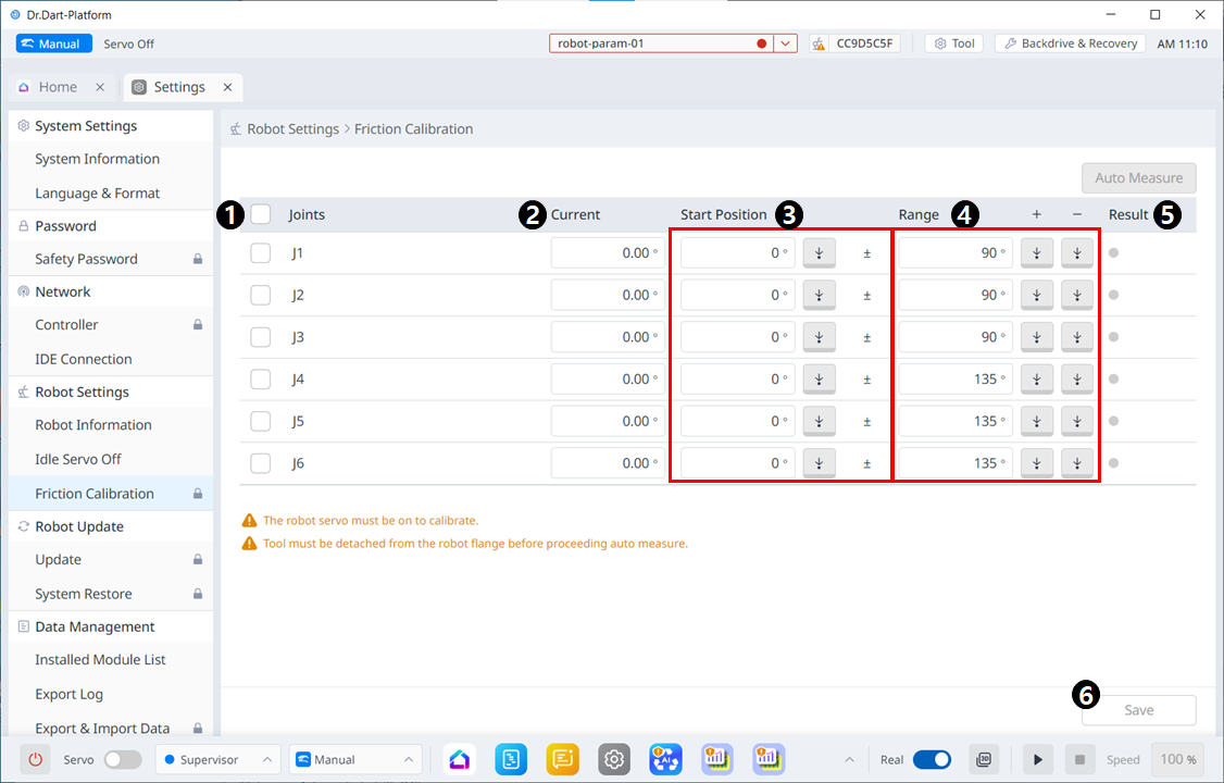 | 3 | Start Position | Auto Measure 수행시 joint가 시작될 자세를 입력합니다. 선택하지 않은 축도 입력이 필요합니다. |