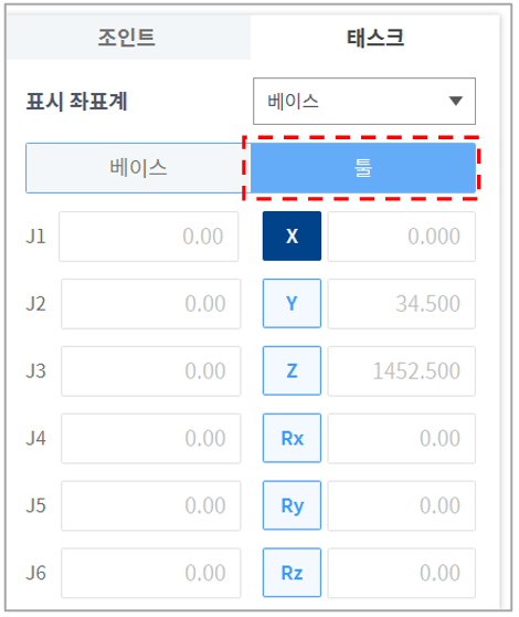 표시 좌표계를 베이스 또는 월드를 선택 후 태스크 좌표계 기준점으로 툴을 설정하십시오.
