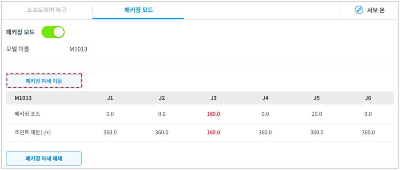 - 패키징 자세를 해제하면 패키징 자세 해체 버튼을 탭 해 로봇을 홈 포지션으로 이동시키고 패키징 모드 토글 버튼을 탭 해 패키징 모드를 비활성화하십시오.