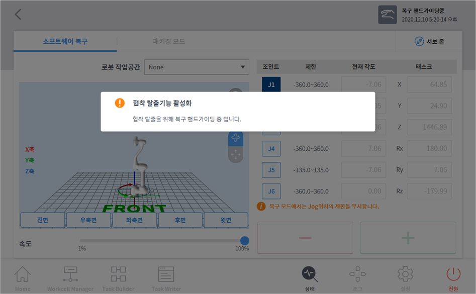 - Interrupted 상태에서 진입할 경우, 안전복구 > 소프트웨어 복구 > 핸드링 가이딩 모드로 진입한다.