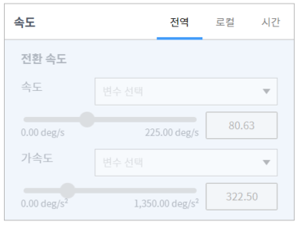 - 속도 및 가속도를 직접 입력하거나 슬라이드 바를 이용해 설정할 수 있습니다.