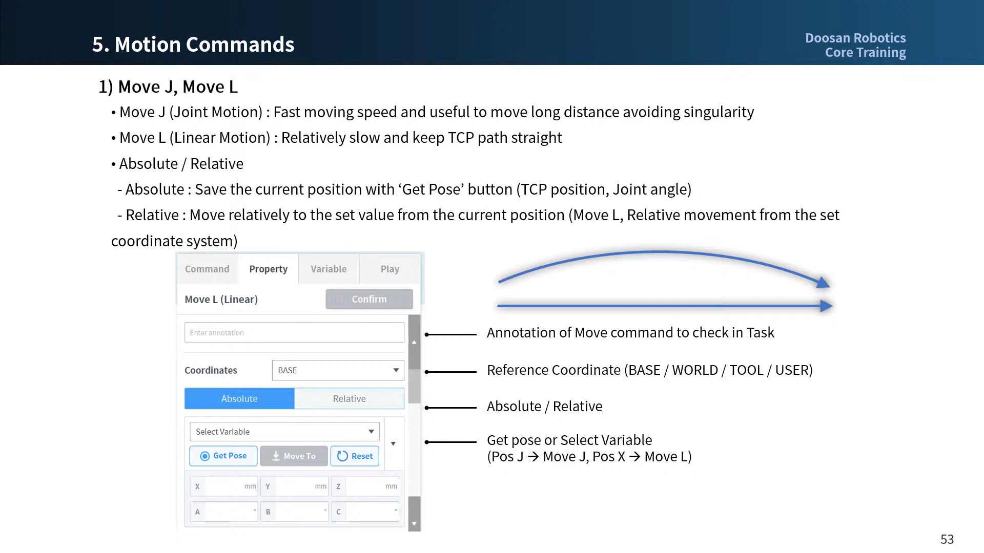 - MoveL에서 L은 선형(Linear)의 약자입니다. 이 모션은 로봇 끝단의 TCP가 목표 자세(위치 및 회전 각도)로 선형으로 이동합니다.