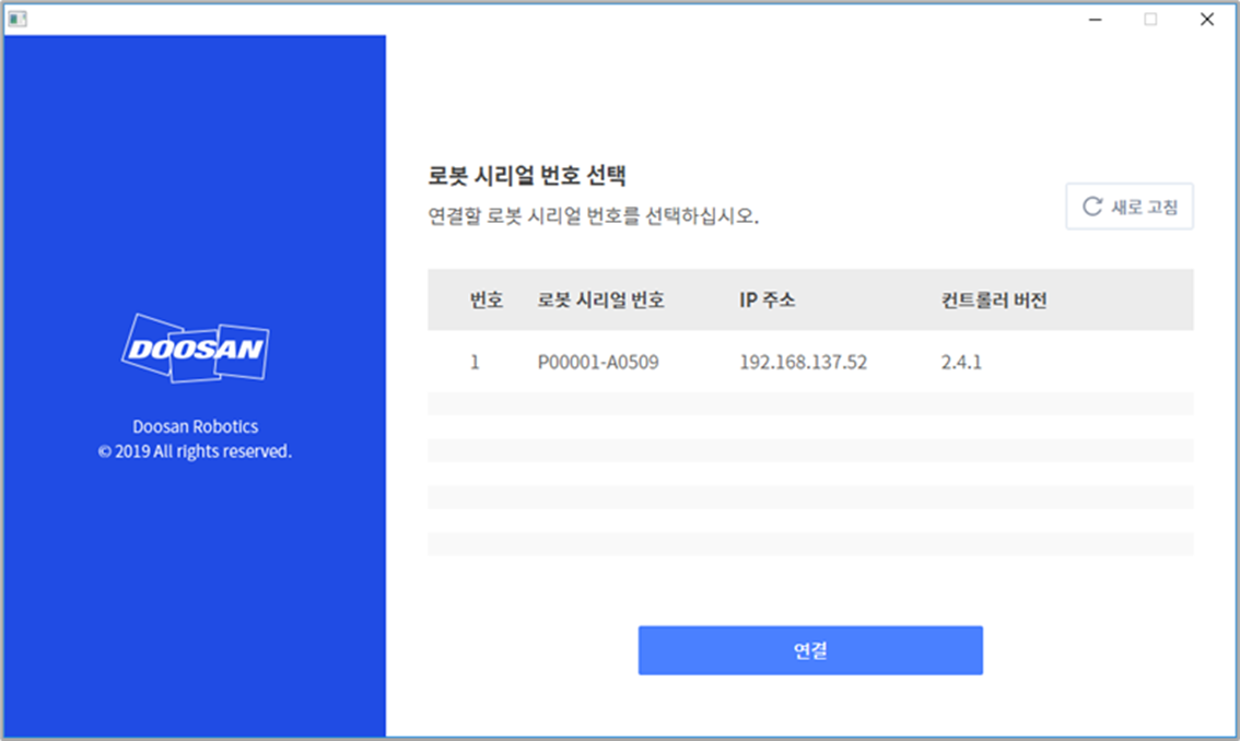- 연결하고자 하는 로봇을 선택 후 '연결' 버튼을 누르십시오.