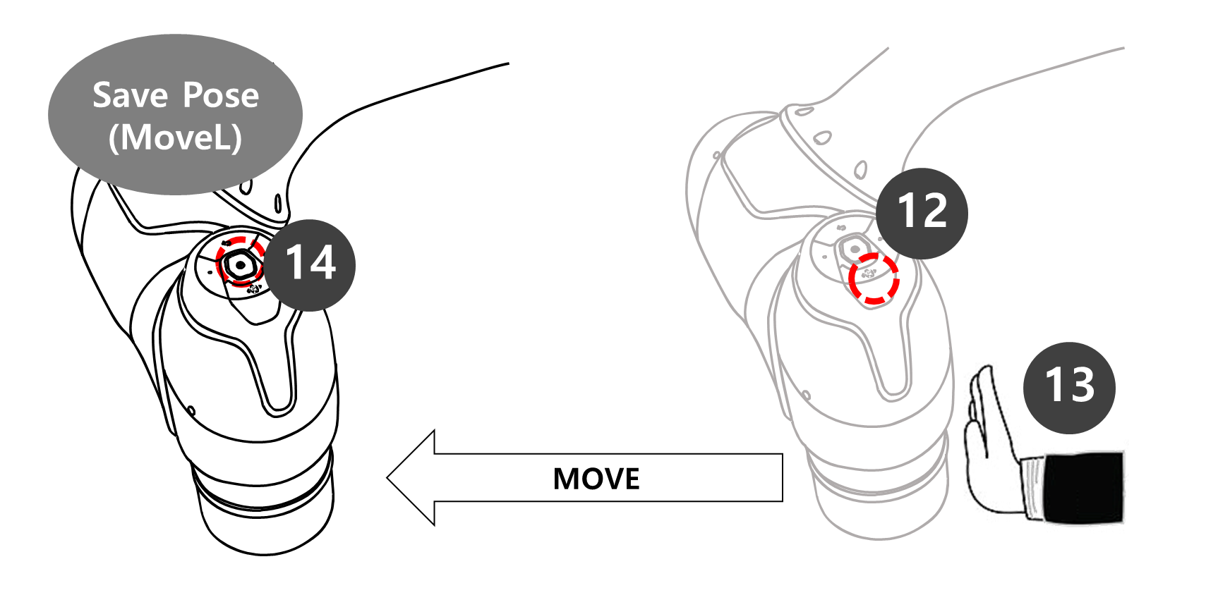 - 한 손으로 로봇 끝단의 상단에 부착된 콕피트에서 손 모양의 핸드가이딩 버튼을 누른 채로 유지하십시오. 12번 ~ 14번 과정은 MoveL의 포즈(Pose)를 저장합니다.