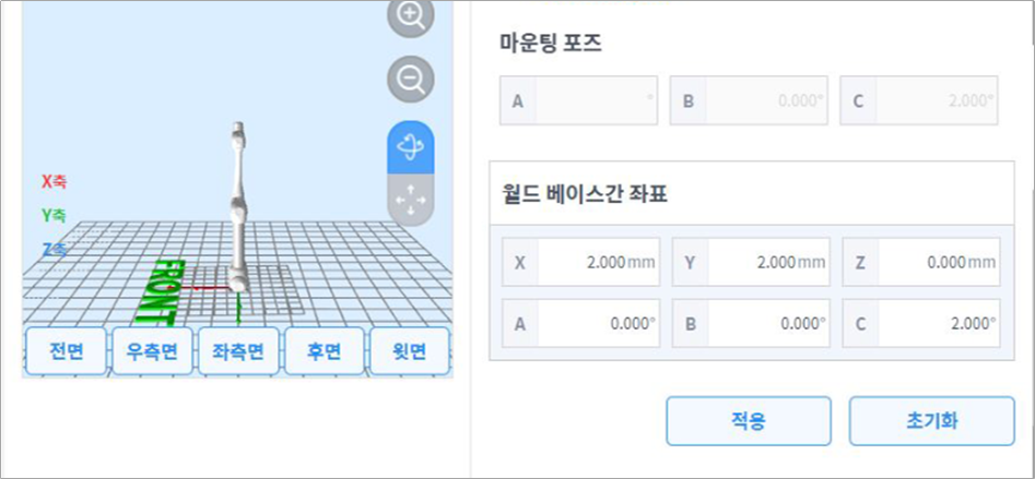 - 우측 중단에 사용자가 설정한 마운팅 포즈(설치기울기)가 표시됩니다. 일반적으로 월드 좌표계는 사용자의 기준에서 작업환경을 기술하므로 월드 좌표계의 Z방향은 천정을 항합니다. 베이스 좌표계는 로봇의 1축 하단평면에 고정되어 있는 좌표계이므로 로봇의 설치위치/자세에 따라 월드 좌표계-베이스 좌표계 관계는 변경됩니다. 상기 그림의 경우는 벽에 로봇을 장착한 상황을 가정한 것입니다. 이 경우 베이스 좌표계의 Z축은 벽에 수직인 방향으로 그림에서는 월드 좌표계의 Y축의 방향과 나란히 놓이게 되며 마운팅포즈는 기울기 90도, 회전 0도로 표시됩니다. 월드-베이스간 관계는 월드 좌표계를 기준으로 베이스 좌표계를 바라본 관계입니다. 사전에 정해진 작업환경의 레이아웃이 있다면 그에 따라서 설정하십시오. X/Y/Z값은 이동을 A/B/C값은 Euler Z-Y-Z정의의 회전을 의미합니다. 로봇의 설치상황에 따라 마운팅포즈를 설정하였다면, 회전각도 B/C는 마운팅포즈의 B/C를 사용하는 것이 적절합니다. 다만, 자동추정기능을 이용하여 마운팅포즈를 설정한 경우 추정값은 오차를 포함할 수 있기 때문에 레이아웃에 정의된 회전각을 따르는 것이 좋습니다.
