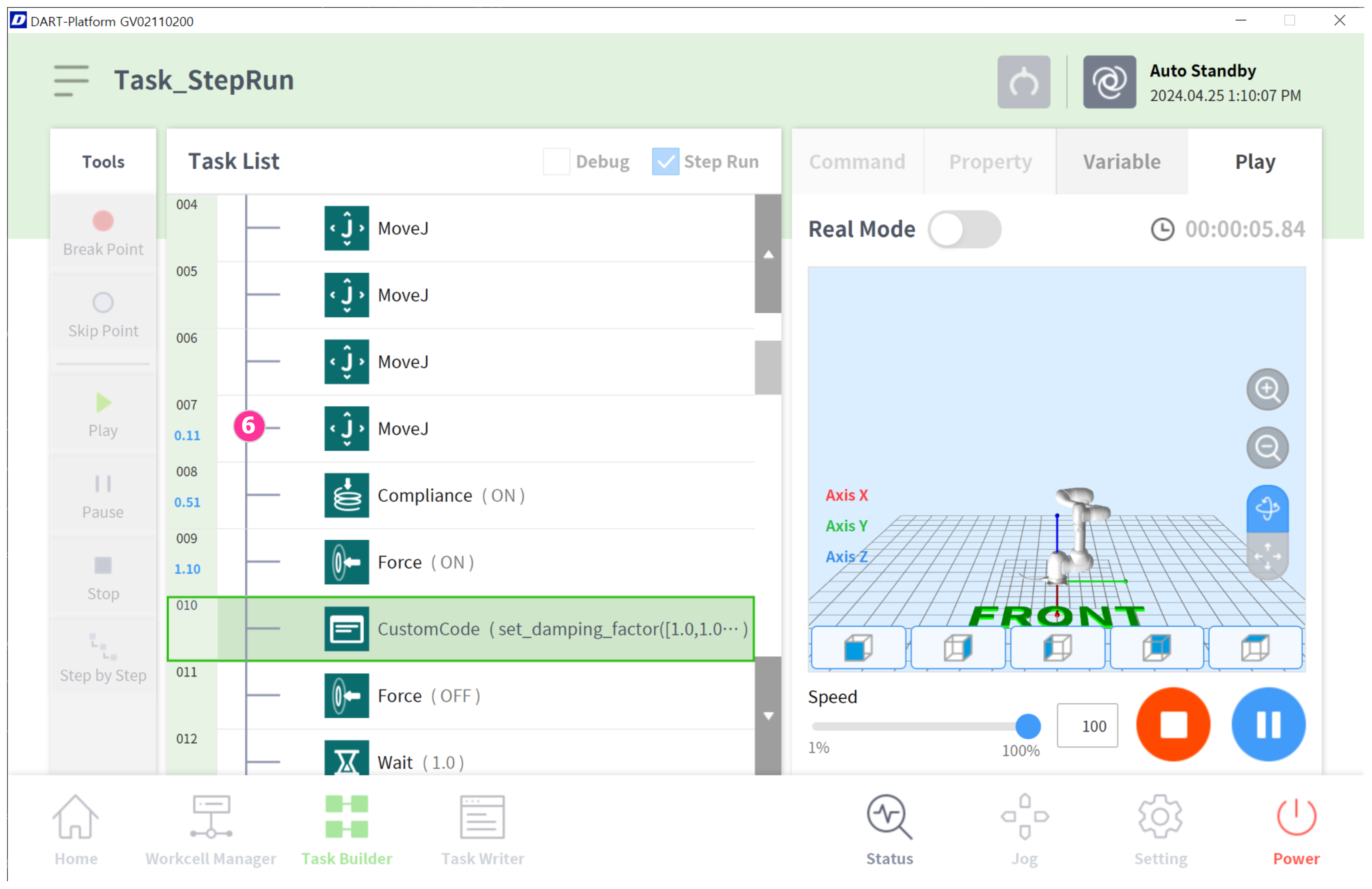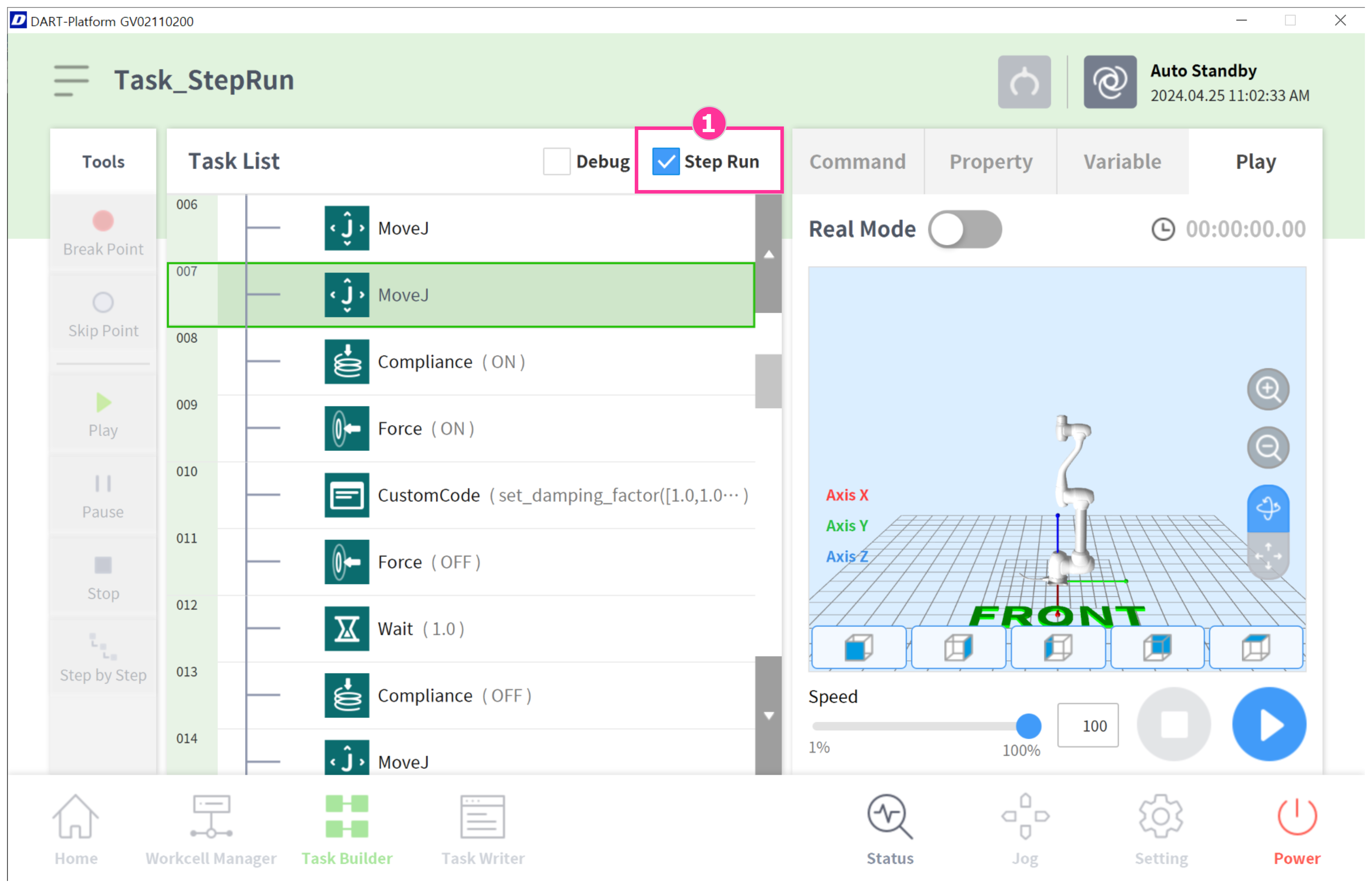 이 설명은 Task Builder 기준으로 스텝 실행 기능 및 사용 방법을 설명하지만 Task Writer에서도 동일한 방법으로 스텝 실행 기능을 사용할 수 있습니다.