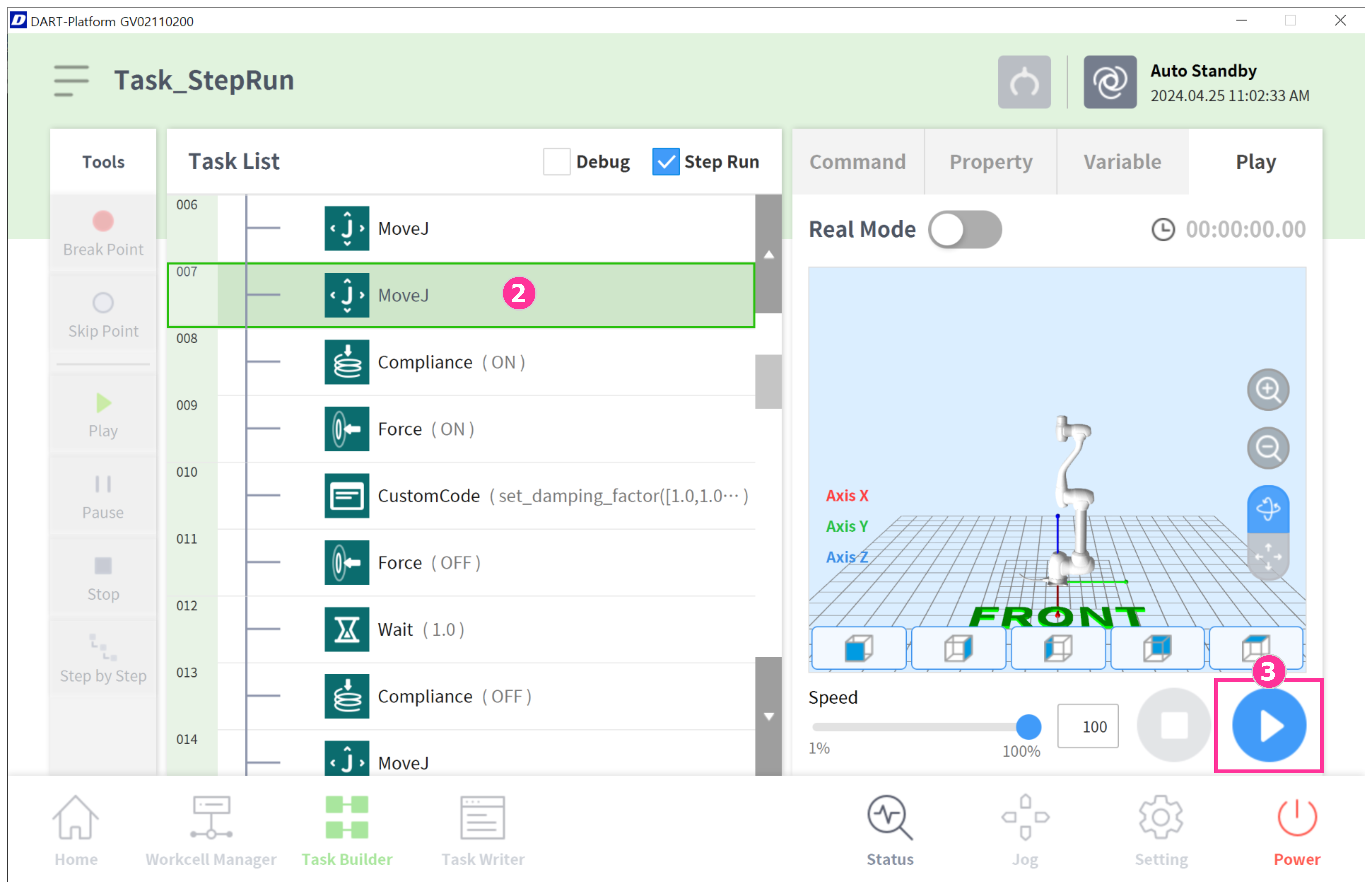 - Task List에서 시작할 명령어를 선택하고(2) Play 버튼을 누릅니다.(3)