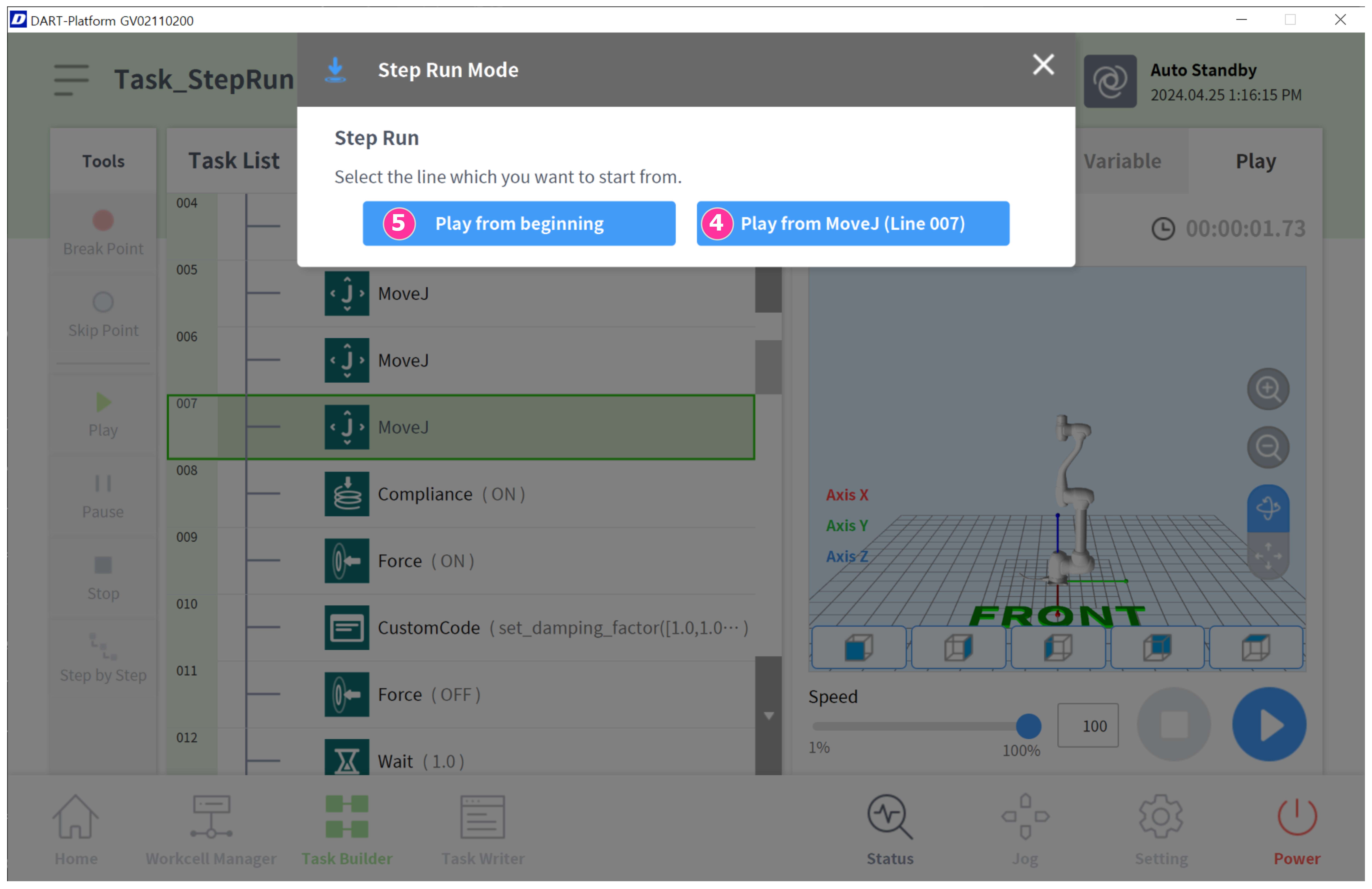 - Step Run Mode 팝업에서 지정된 명령어에서 시작하도록 버튼을 선택합니다.(4)