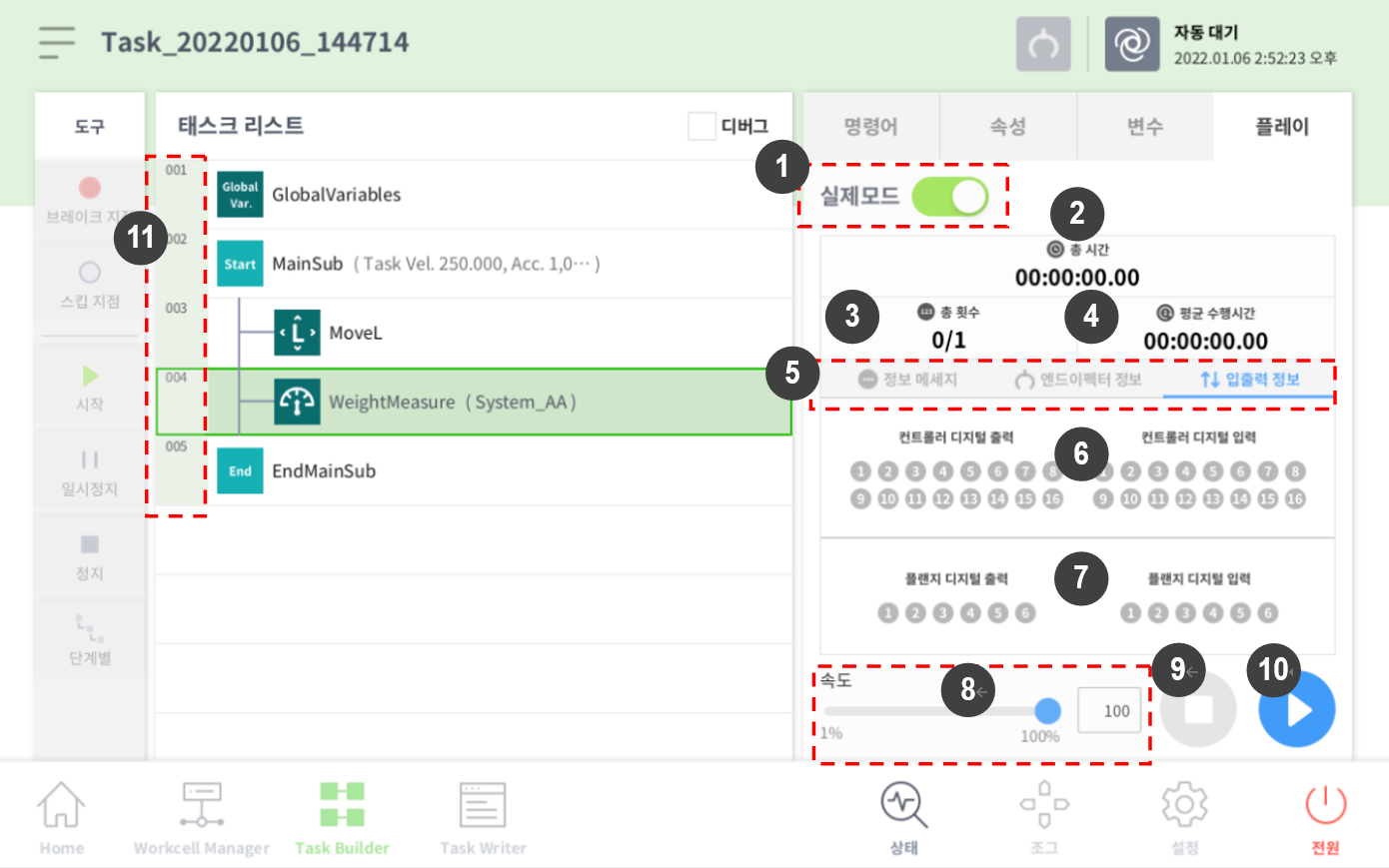 10 | 재생/일시정지 토글 버튼 | 태스크 리스트의 작업을 재생 혹은 일시 정지할 수 있습니다. |