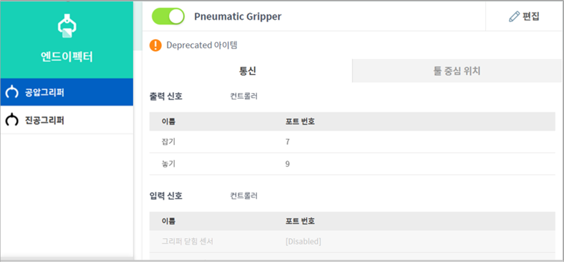 비활성 워크셀 아이템을 선택하면 “Deprecated 아이템”이란 문구와 함께 선택한 워크셀 아이템의 설정 정보가 표시됩니다.비활성 워크셀 아이템은 신규 등록은 할 수 없지만 설정 정보를 확인하거나 사용 중인 태스크 프로그램 구동에는 사용할 수 있습니다.