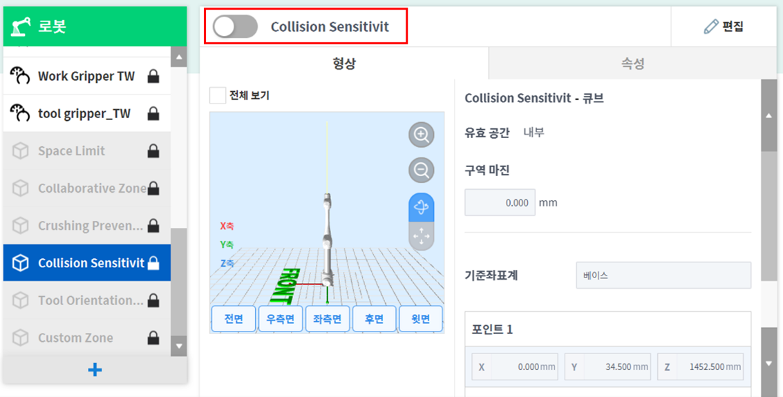 충돌 감지 민감도 감소 구역(Sensitivity Reduction Zone)을 설정하려면 로봇 워크셀에서