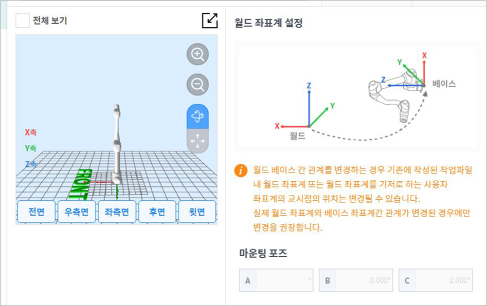월드 좌표계와 베이스 좌표계의 관계를 나타낸 그림과 주의사항을 꼭 참조하여 주십시오.