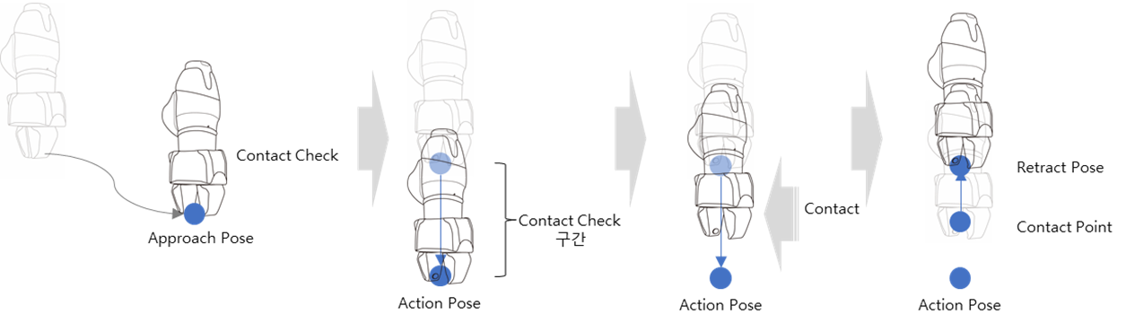 접촉 감지 기능: 사용자가 입력한 접촉 외력접촉 판단 범위 값을 기준으로 대상물과의 접촉을 인식하여 해당 위치에서 멈추고 그리퍼를 작동시켜 대상물을 파지합니다.