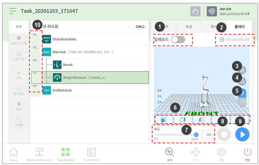 태스크 빌더의 가상 모드 플레이 화면은 아래와 같이 구성되어 있습니다.