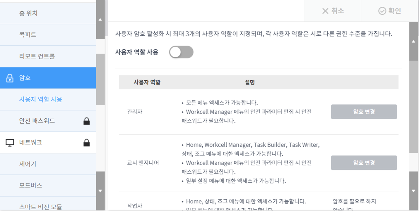- 사용자 역할 On/Off 및 사용자 역할에 대한 설명, 암호 변경 버튼이 설정 관리 창에 나타납니다.