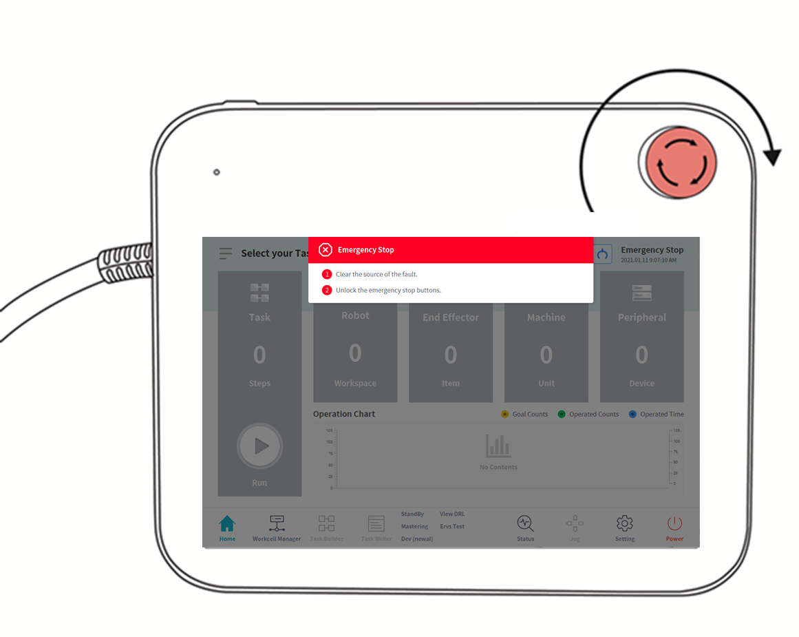 로봇 설치 후 첫 부팅이 완료되면, 티치펜던트의 비상 정지 버튼이 눌려 있어 경고 팝업이 나타납니다. 이때, 비상 정지 버튼을 해제해야 로봇을 사용할 수 있습니다.