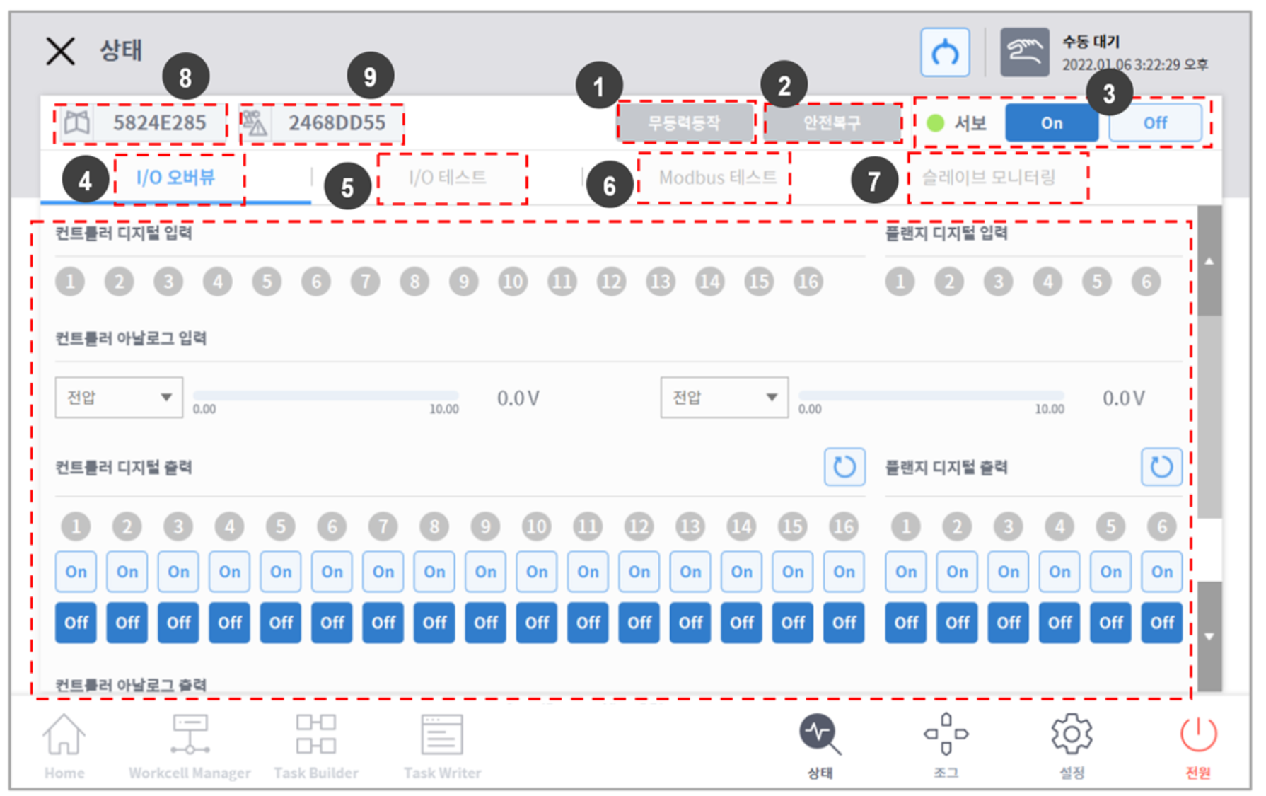 상태 창은 팝업 창이므로 홈, 태스크 빌더, 태스크 라이터 화면에서 자동 모드로 실행 중에도 주 메뉴의 상태 버튼을 누르면 상태 화면이 팝업되어 입출력 정보를 확인할 수 있습니다. 오트모드로 실행 중에는 출력 테스트를 진행할 수 없습니다.