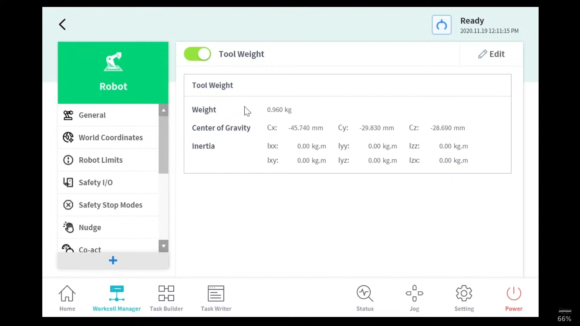 워크셀 아이템은 등록(Confirm)한 이후에 토글 스위치를 활성화 상태로 전환하여야만 워크셀 아이템을 사용할 수 있습니다. 활성화된 툴 무게(Tool Weight) 워크셀 아이템은 티치펜던트 상단의 툴 설정 아이콘(