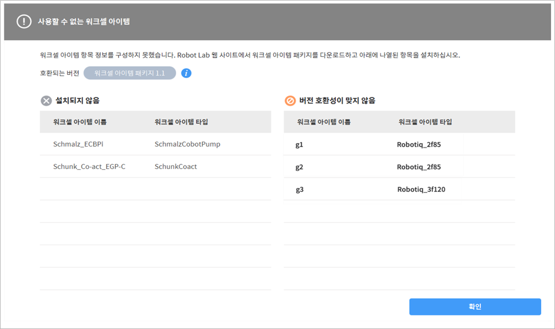 생성하였던 3rd Party 워크셀 아이템(workcell item)중 설치되지 않았거나 버전 호환성이 맞지 않는 항목이 있을 경우 사용할 수 없는 워크셀 아이템 목록에 표시가 됩니다.