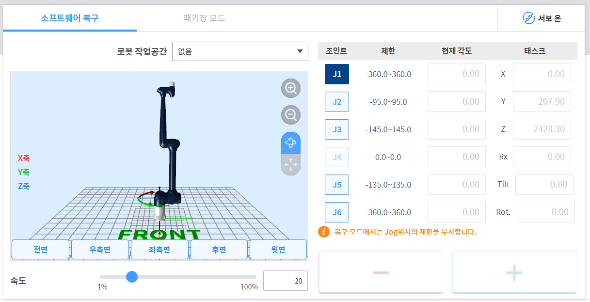 소프트웨어 복구 모드는 조인트 각도 제한이 3도를 초과한 상태에서 사용할 수 없습니다.