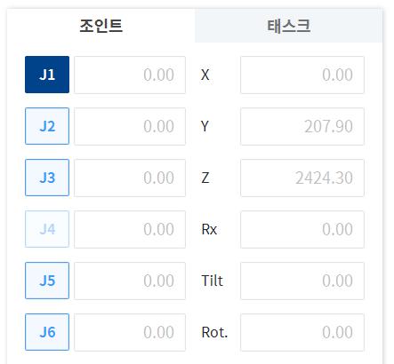 각도를 조절할 축(J1~J6)을 선택하십시오.(P series 모델은 J4 비활성)