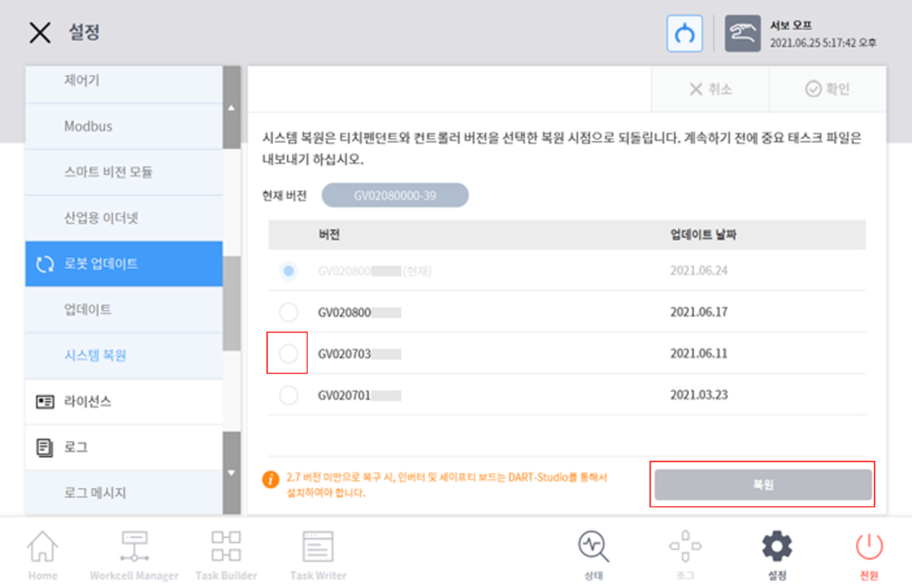 로봇 시스템을 사용자가 선택한 특정 버전으로 복원시킵니다.