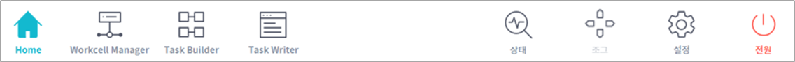 서보 오프: 서보 오프 상태에서는 홈, 상태, 설정, 전원 메뉴 이외의 주 메뉴 버튼은 비활성화 됩니다. 서보 오프 상태에서 서보 온 상태로 변경하려면 주 메뉴에서 상태 버튼을 탭 하여 상태 화면에서 서보 온을 버튼을 탭 하십시오. 로봇이 서보 온 상태가 되면 워크셀 매니저, 태스크 빌더, 태스크 라이터, 조그 버튼이 활성화됩니다.
