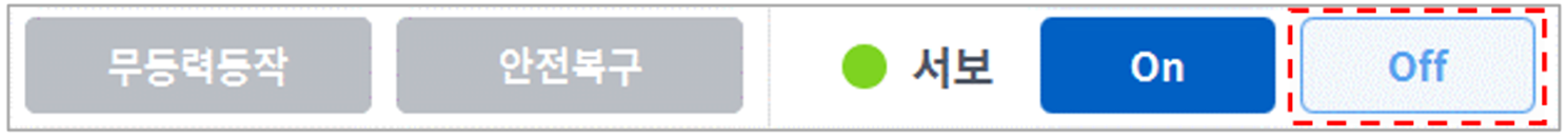 서보 온(Servo On) 상태에서 서보 오프(Servo Off) 상태로 전환하려면 주 메뉴의 상태 버튼을 탭 한 후 상태 화면 오른쪽 상단의 서보 Off 버튼을 탭 하십시오.
