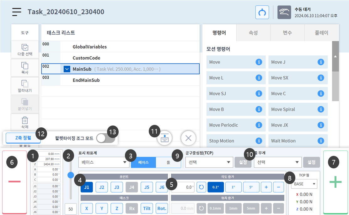 12 | Z축 정렬 | z축이 베이스 z축과 정렬되도록 로봇을 움직입니다. |