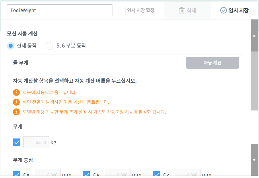 전체동작: 전체 조인트를 이용해 툴 무게를 측정합니다.