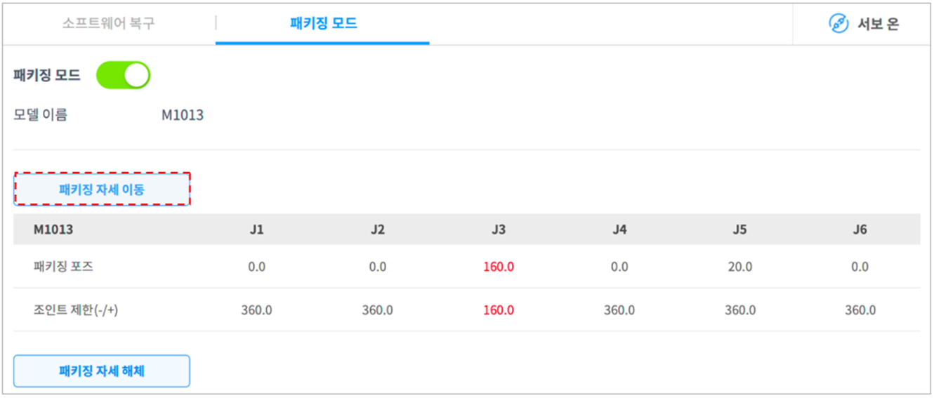 패키징 자세 이동 버튼을 탭 하십시오.