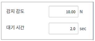 Nudge를 설정하려면 로봇 워크셀에서 넛지 아이템을 선택하십시오. 넛지 입력으로 감지할 힘(넛지 힘) 및 넛지 인식 후 작업 재개까지의 대기 시간(딜레이 시간)을 추가 입력할 수 있습니다.